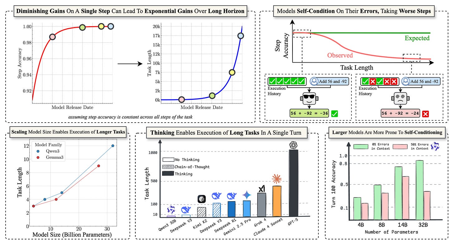 The Illusion of Diminishing Returns: Measuring Long Horizon Execution in LLMs. The authors show that scaling LLMs boosts their ability to execute longer-horizon tasks by separating execution capability from per-step accuracy and reducing harmful self-conditioning effects.