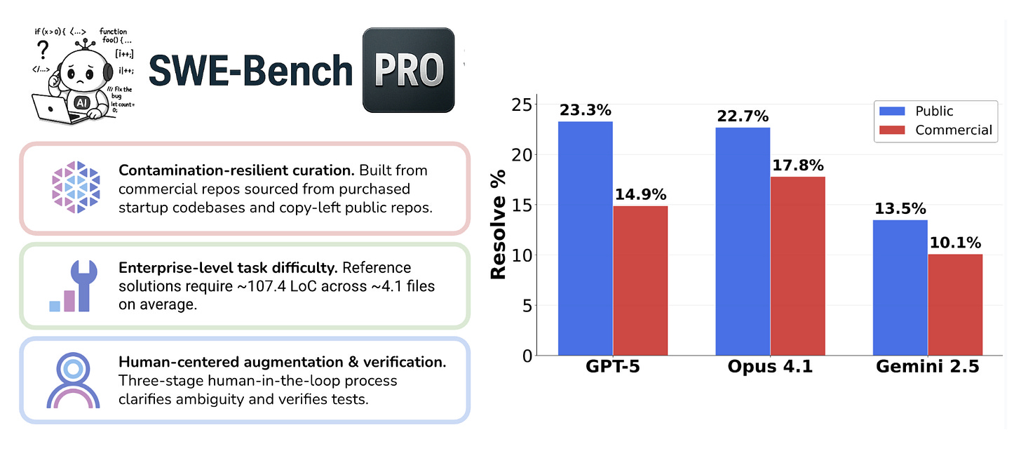 SWE-Bench Pro: Can AI Agents Solve Long-Horizon Software Engineering Tasks?. It introduces a contamination-resistant, industrially focused benchmark with GPL and commercial code subsets, longer multi-file tasks, a human-in-the-loop verification workflow, and diagnostic analyses showing current LLM agents score much lower (≤23.3% public, ≤17.8% commercial) than on prior benchmarks.
