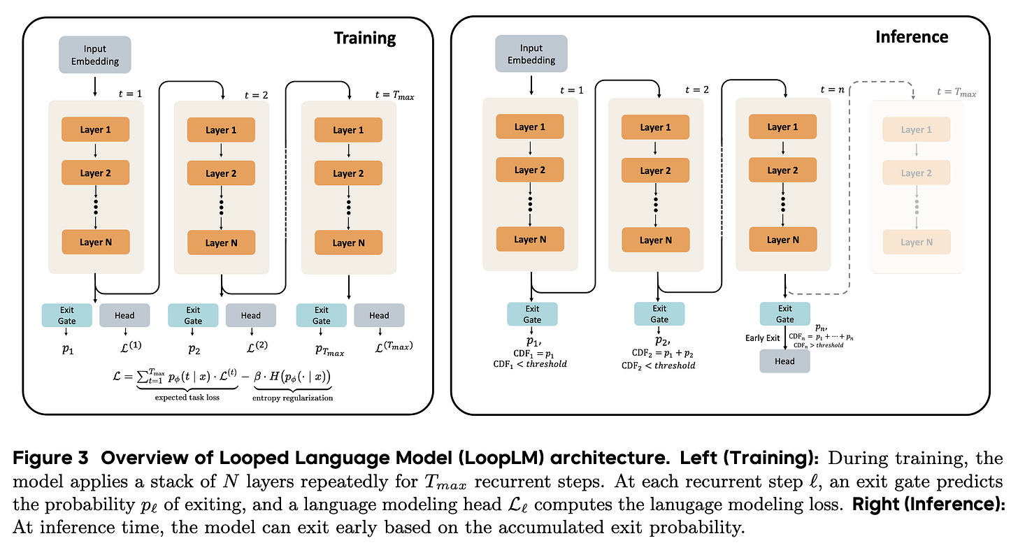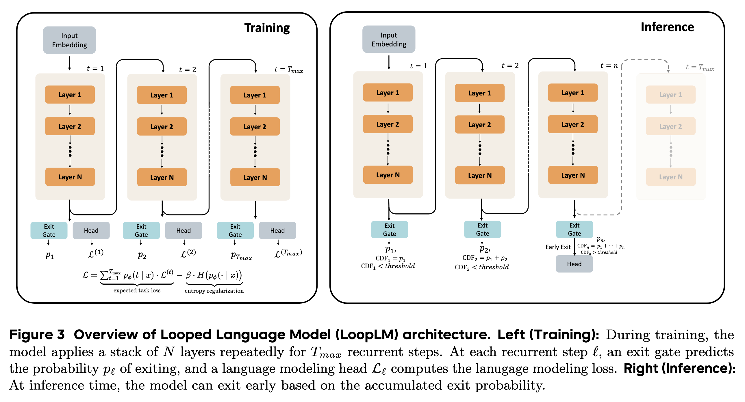 Scaling Latent Reasoning via Looped Language Models. The authors show that recursively reusing weight‑tied layers with an entropy‑regularized adaptive early‑exit mechanism yields 2–3× parameter‑efficiency gains at scale.