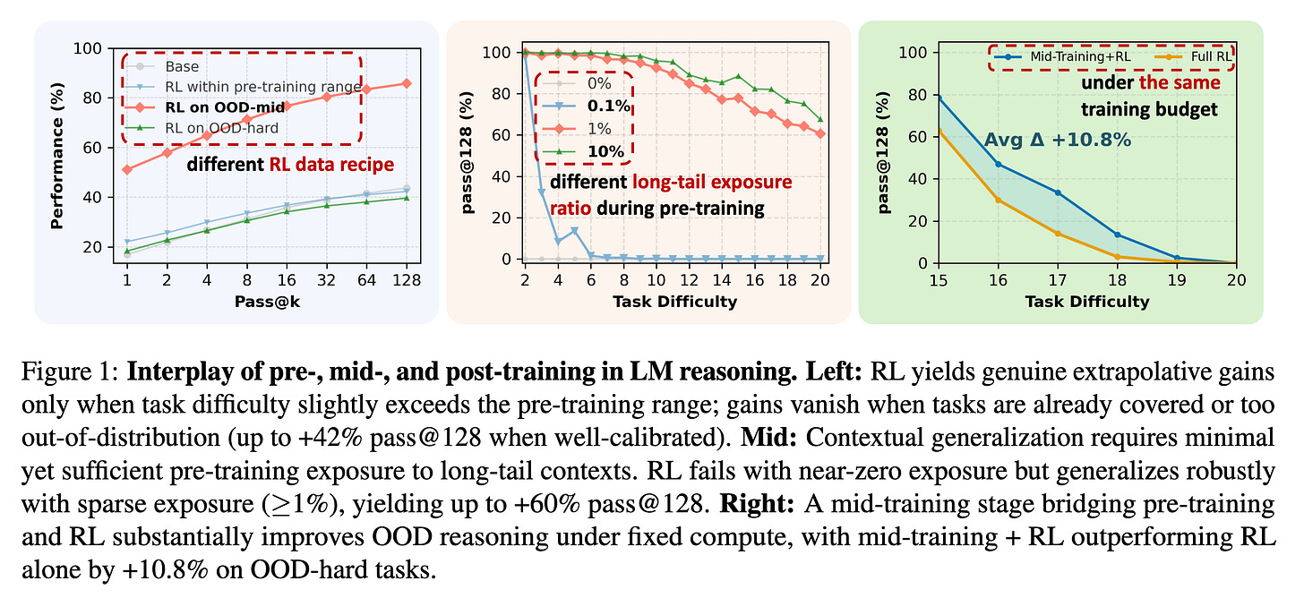 On the Interplay of Pre-Training, Mid-Training, and RL on Reasoning Language Models. A controlled synthetic framework shows RL yields genuine reasoning gains only when pre-training leaves room for improvement and RL data match the model’s competence edge; sparse pre-training exposure enables contextual transfer that RL can amplify; a mid-training bridge materially boosts in- and out-of-domain performance; and process-based rewards reduce reward hacking and improve reasoning fidelity.