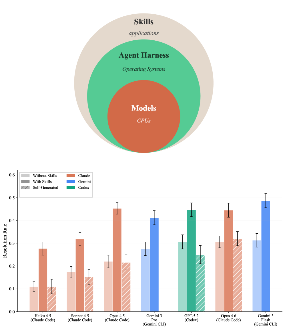 SkillsBench: Benchmarking How Well Agent Skills Work Across Diverse Tasks. This benchmark measures how curated versus self‑generated Skills affect agent success across 84 terminal‑based tasks, evaluating seven model‑harness configurations over 7,308 trajectories to identify which Skill components, harness behaviors, and failure modes drive gains or harms.